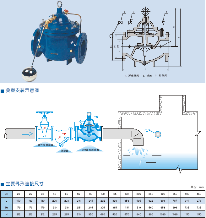 100X隔膜式遙控浮球閥是兼具多種功能的水力操作式閥門。要安裝于水池或高架水塔的進水口處,當水位達到設定的高度時,主閥由浮球導閥控制關閉進水口停止供水;當水位下降后,主閥同浮球開關控制打開進水口向水池注水,實現自動補水。液位控制精確,不受水壓干擾;100X隔膜式遙控浮球閥可隨水地池的高度及使用空間任意位置安裝,維護、調試、檢查方便、密封可靠、使用壽命長。隔膜式閥門性能可靠。強度高、動作靈活適用于45MM□徑以下的管道。DN500MM□徑以上的建議使用活塞式。 |