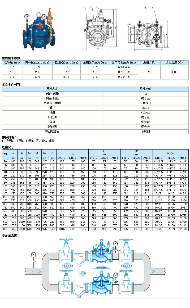 200X減壓穩壓閥由主閥、導閥、針閥、球閥、微型過濾器和壓力表組成水力控制接管系統。使用時,當調定出口壓力后,能自動保持穩定出口壓力。本產品利用導閥自力控制,不需要其它裝置和能源,保養簡便,壓力控制準確度高,受進口壓力和流量影響小,減壓穩壓可靠。本系列閥門產品廣泛用于高層建筑、生活區等供水管網系統及城市供水工程。當閥門從進口端給水時,水流過針閥進入主閥控制室,出口壓力通過導管作用到導閥上。當出口壓力高于導閥彈簧設定值時,導閥關閉。控制室停止排水,此時主閥控制室內壓力升高并關閉主閥,出口壓力不再升高。當閥門出口壓力降到導閥彈簧設定壓力時,導閥開啟,控制室向下游排水。由于導閥系統排水量大于針閥的進水量,主閥控制室壓力下降。進口壓力使主閥開啟。在穩定狀態下,控制室進水、排水相同,主閥開度不變,出口壓力穩定。調節導閥彈簧即可設定出口壓力。 |