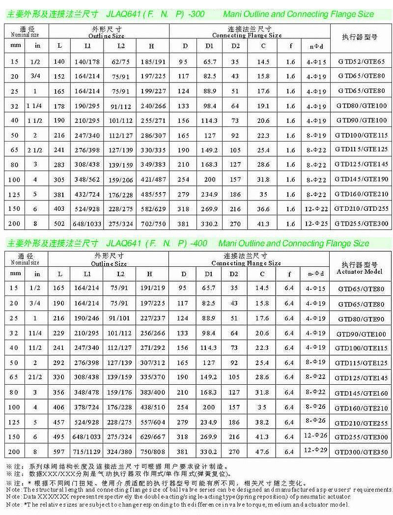 ANSI標準氣動球閥JLQ641結構長度及連接法蘭尺寸可根據用戶要求設計制造。主要零部件及密封圈的材質可根據實際工況條件或用戶特殊要求設計選用。數據XXX/XXX分別表示氣動執行器雙/單作用式(彈簧復位)。根據不同閥門扭距使用介質選配的執行器型號可能有所不同,相關尺寸隨之變化。