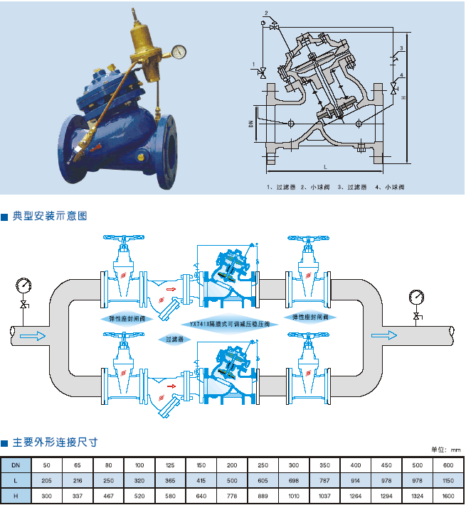 YX741X隔膜可調(diào)式減壓穩(wěn)壓閥是暗安裝于高層建筑給排水系統(tǒng)管道上,將進(jìn)口壓力減至某一需要的出口壓力的特種閥門。該閥門依靠本身能量使出口壓力保持穩(wěn)定在設(shè)定直,即出口壓力不因進(jìn)口壓力及流量的變化而變化,并且閥門控制系統(tǒng)的進(jìn)口處裝有一個(gè)自清潔濾網(wǎng),利用流體特性,使比重較大、直徑較大的懸浮顆粒不會(huì)進(jìn)入控制系統(tǒng),確保系統(tǒng)循環(huán)暢通無阻,使用門能安全可靠地運(yùn)行。系統(tǒng)動(dòng)作靈敏,使用壽命長。 |