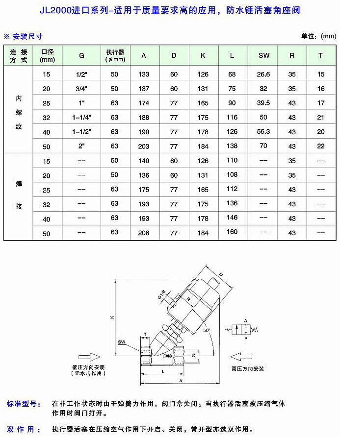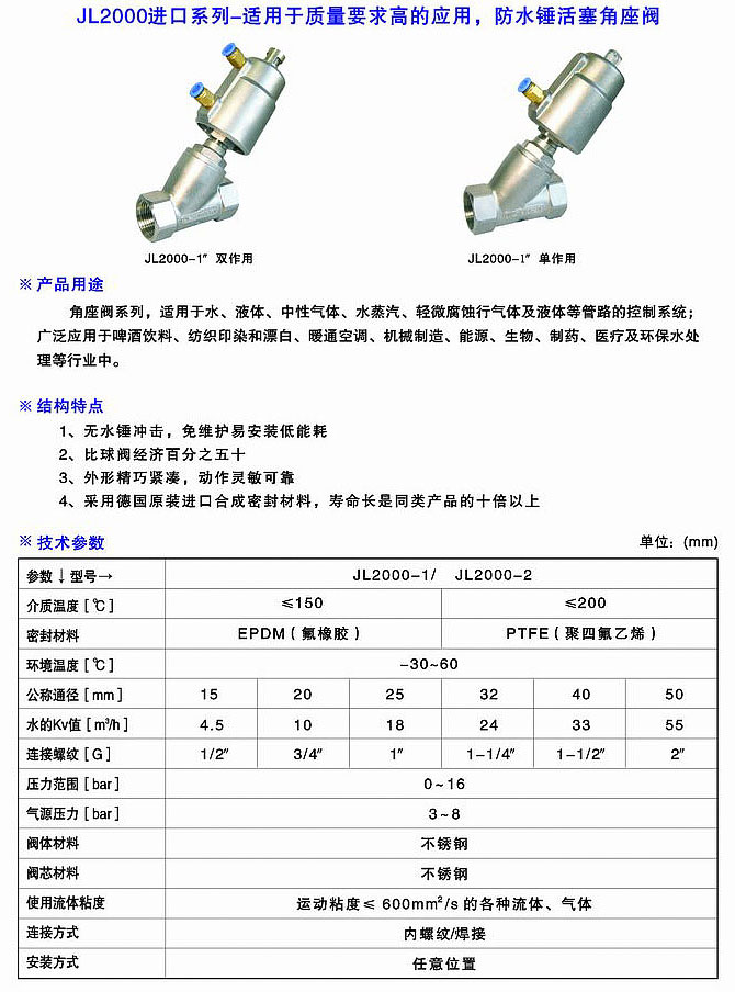 JL2000進口系列單作用角座閥