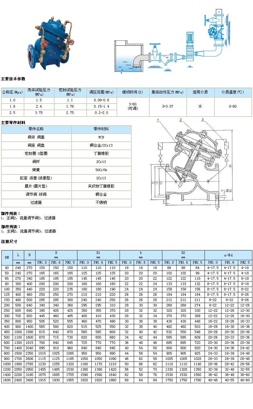 工作原理 當(dāng)水泵起動(dòng)起后,水壓作用于主閥閥盤下面和控制室下腔,此壓力使主閥開啟,控制室上腔的水經(jīng)過調(diào)節(jié)閥B緩緩排到出口端,主閥緩緩開啟。設(shè)定調(diào)節(jié)閥的開度可得到合適地主閥開啟速度。當(dāng)水泵停止工作后,進(jìn)口端水壓迅速下降,在自重、彈簧壓力作用下快速關(guān)閉大部分開度,防止了水倒流余下的開度由控制室上腔的水壓和下腔水壓聯(lián)合作用下緩緩關(guān)閉,關(guān)閉速度減慢形成了緩沖,防止壓力劇增。設(shè)定調(diào)節(jié)閥A、B的開度和開度比可得到合適的閥門啟閉速度。